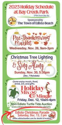 This year's parade theme is: SEASHELLS & SLEIGHBELLS. We encourage participation from the beach, island & beyond. We welcome churches, schools, clubs, individuals, neighborhoods, families, you name it! Decorate a truck, boat, golf cart, bikes, tractor....use your imagination and become part of our island history. Be as creative as you can with music, lights or whatever inspires you.