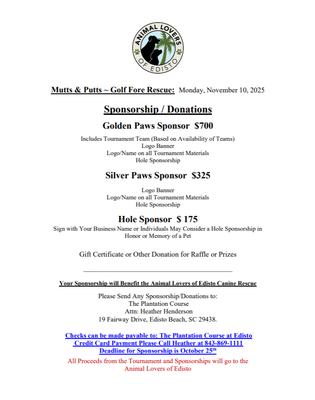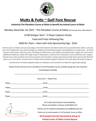 The Plantation Course at Edisto will be hosting the 6th Annual Mutts & Putts ~ Golf Fore Rescue tournament to benefit the Animal Lovers of Edisto Canine Rescue!